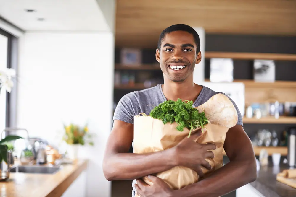 집배원이 작은 소포와 봉투를 들고 있고, 배경에 흰색 배달 트럭이 있다.
