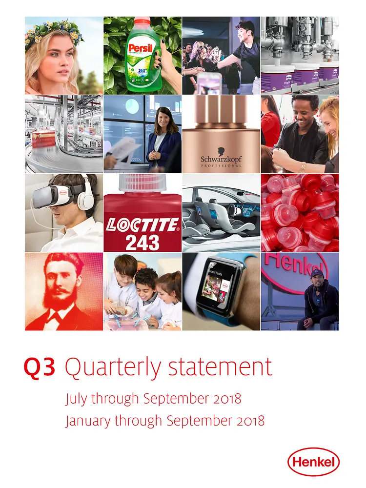 2018년 1 ~ 9월에, 헨켈은 150억 1천 500만 유로의 매출을 형성하였다. 통화 효과 및 인수/ 투자 회수의 영향을 배제한 자체 매출은 2.4%의 양호한 성장세를 보였다. 외화 효과는 매출을 -6.0% 감소시켰다.