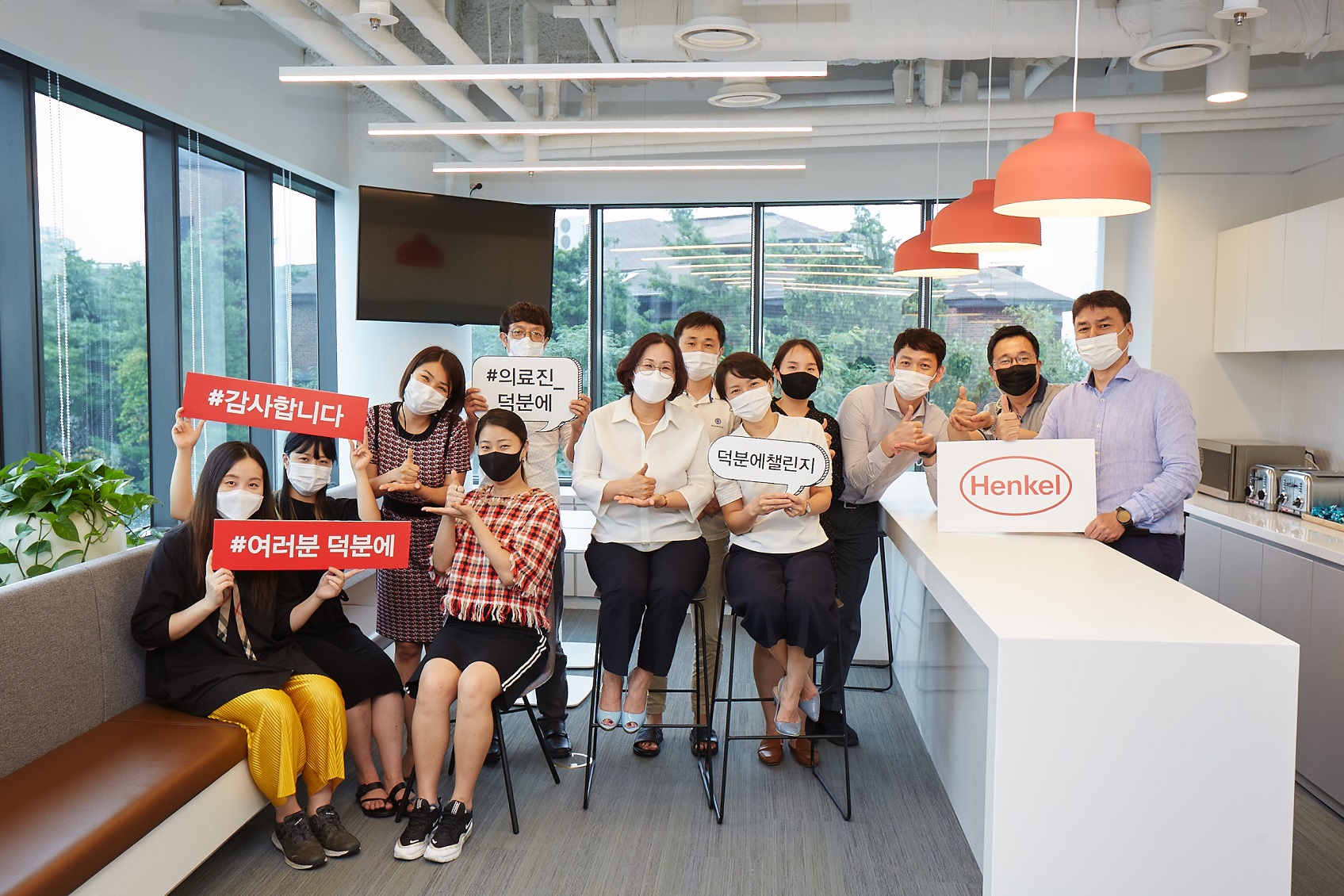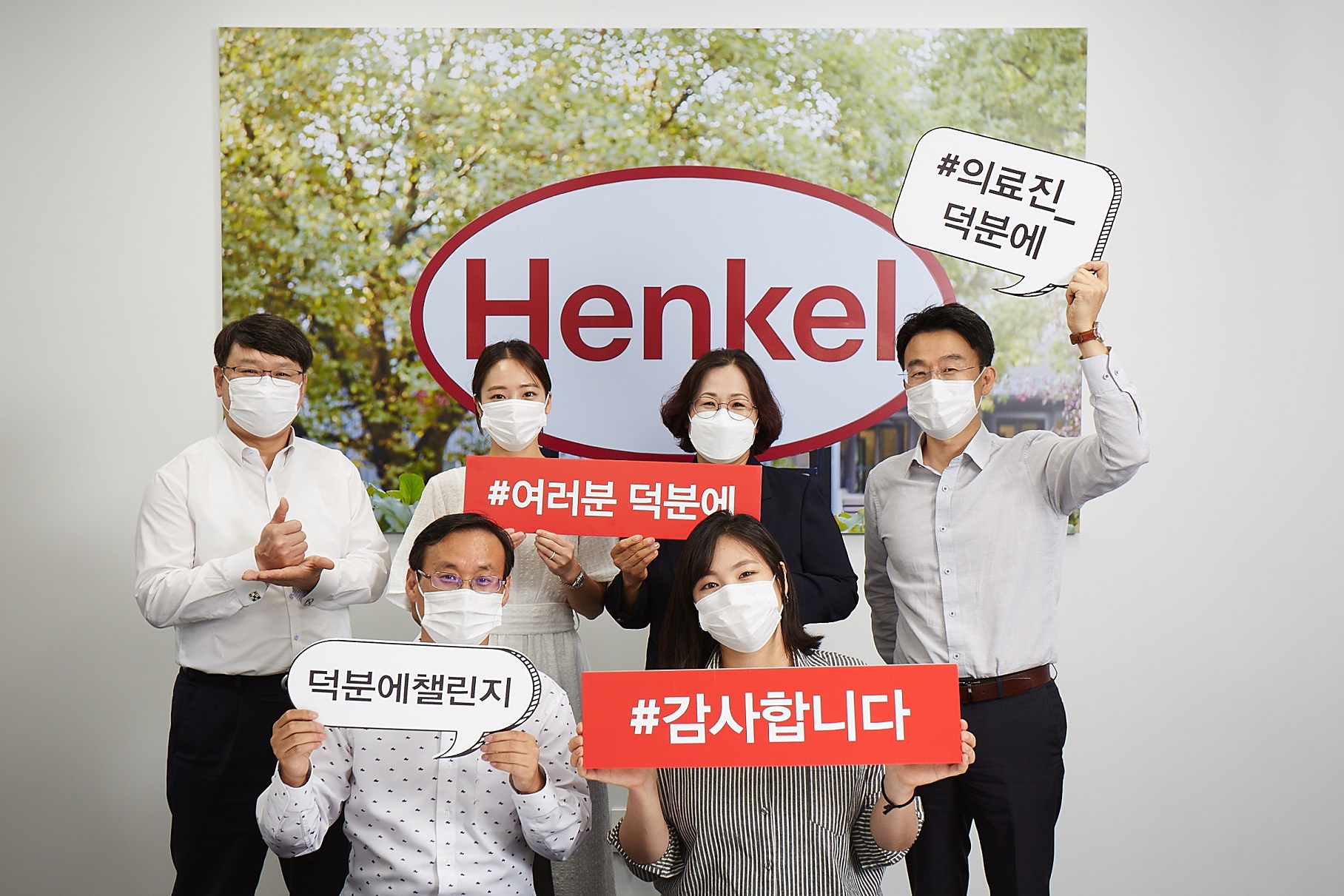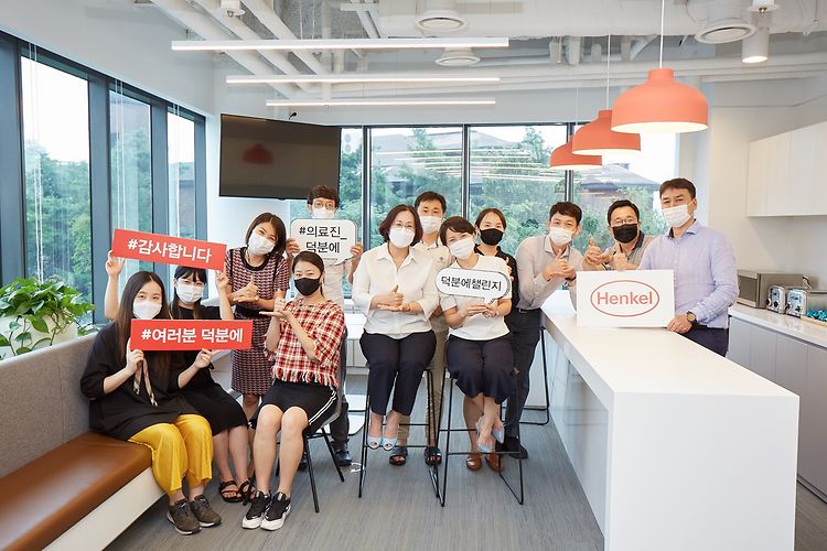 헨켈코리아의 김영미 대표이사가 코로나19(COVID-19) 진료를 위해 최전선에서 노력하고 있는 의료진에게 감사와 응원의 마음을 전하고자 직원들과 함께 ‘덕분에 챌린지’에 동참했다.