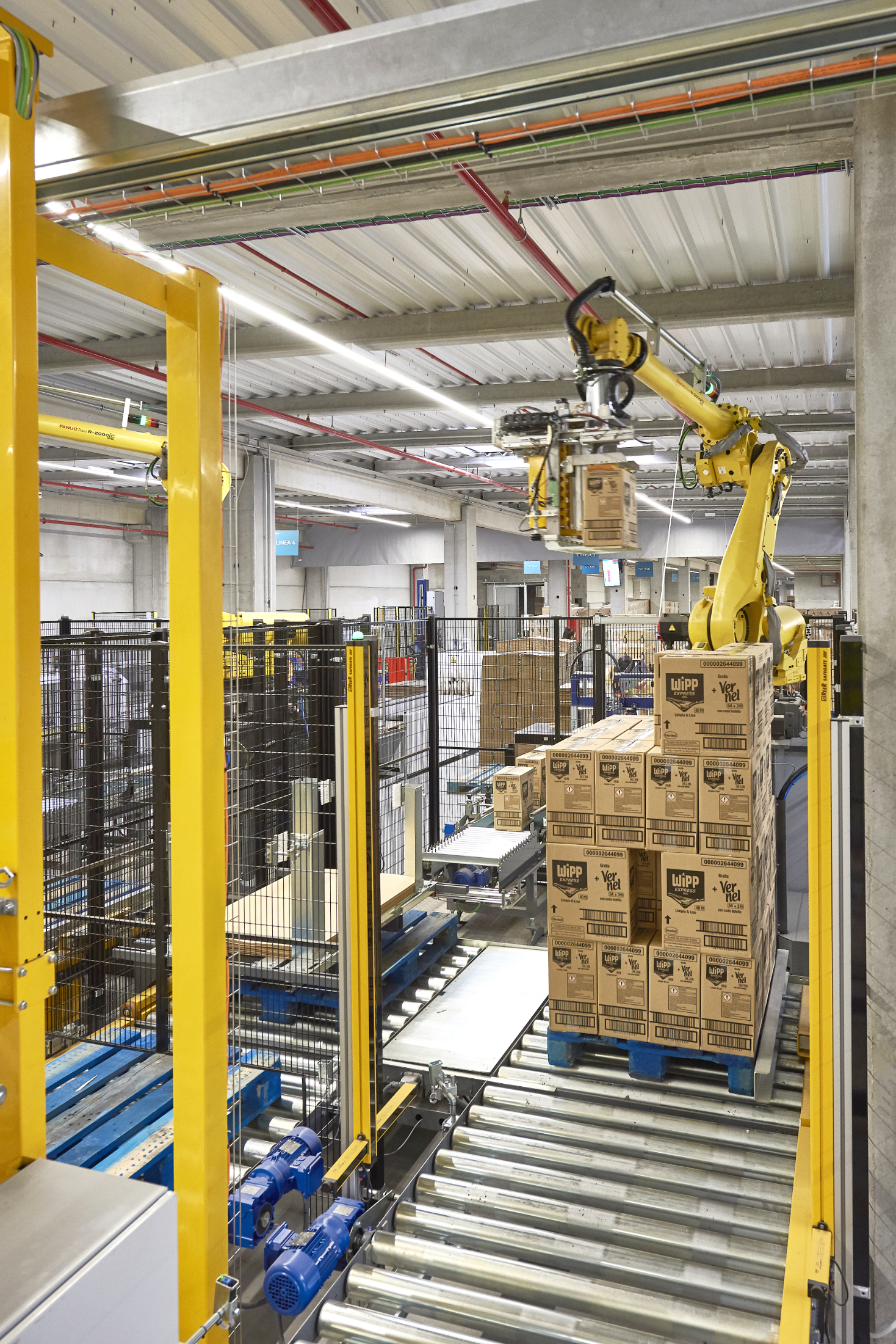 The automated area is divided into five blocks. Each block provides a special stacker crane with 38 double cycles per hour and two high-tech conveyors serve to unload and load shuttles from the production site automatically. Also, the loading and unloading of pallets from trucks can be done automatically through a new automatic launcher transport system due to newest technologies and digitized supply chain processes. Through the implementation of a new innovative management software, the warehouse’s energy consumption can be reduced through eliminating inefficiencies while at the same time increasing the storage capacities. The safety of equipment is guaranteed by a modern fire protection system and the highest work protection standards.