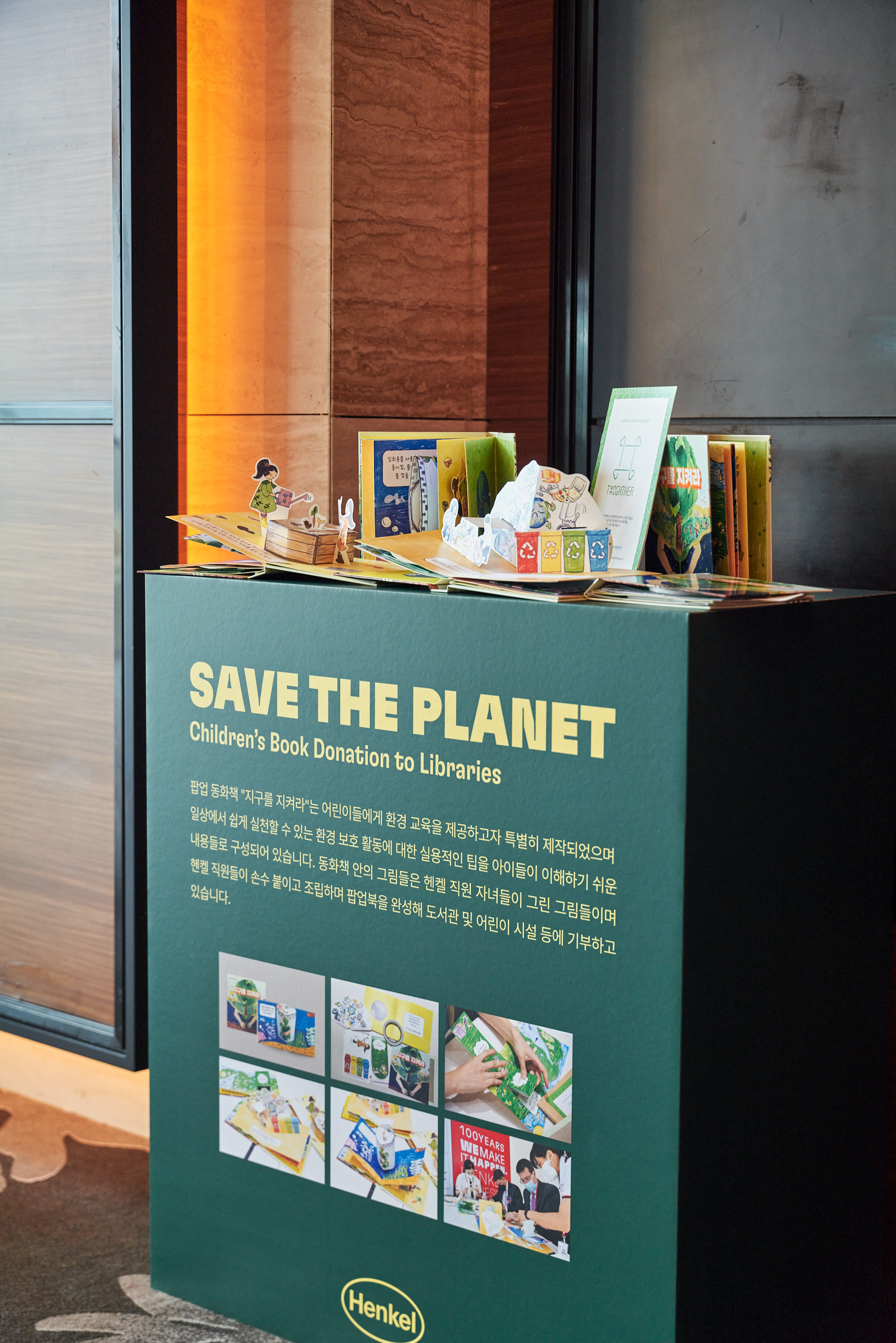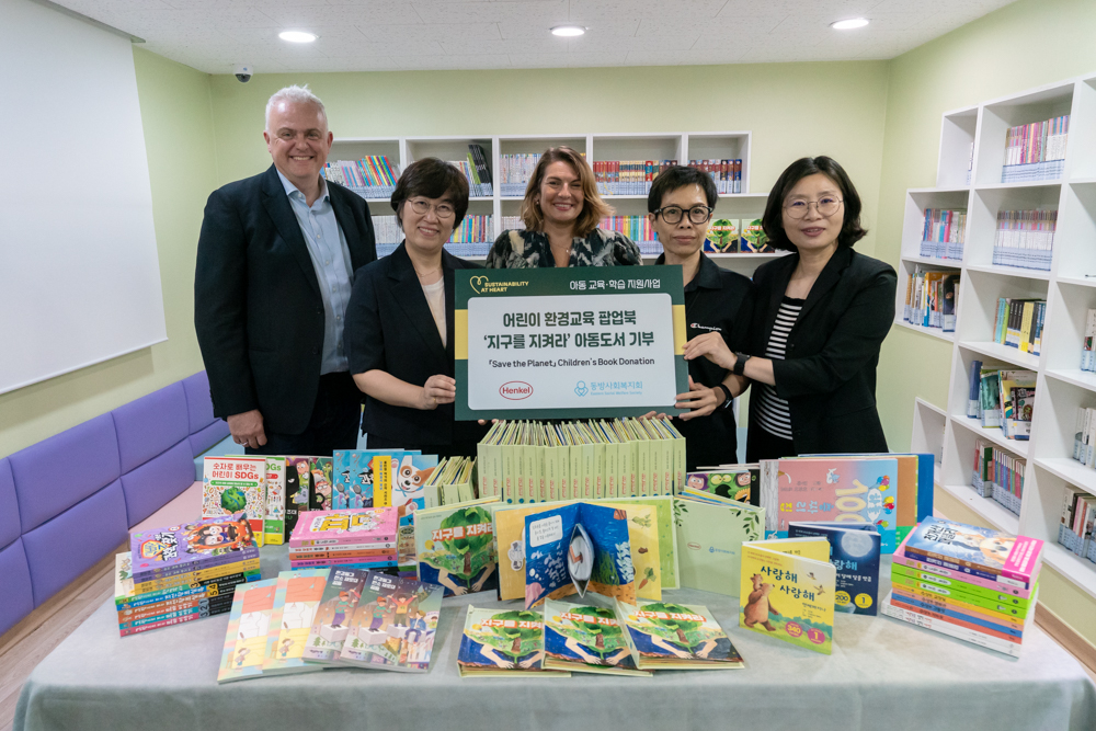 헨켈코리아 임직원들은 이번에 기부한 어린이 환경교육 팝업 동화책 ‘지구를 지켜라’의 제작과정에 자발적으로 참여했으며, 기부식 이후 도서 비치 활동까지 함께 해 의미를 더했다.