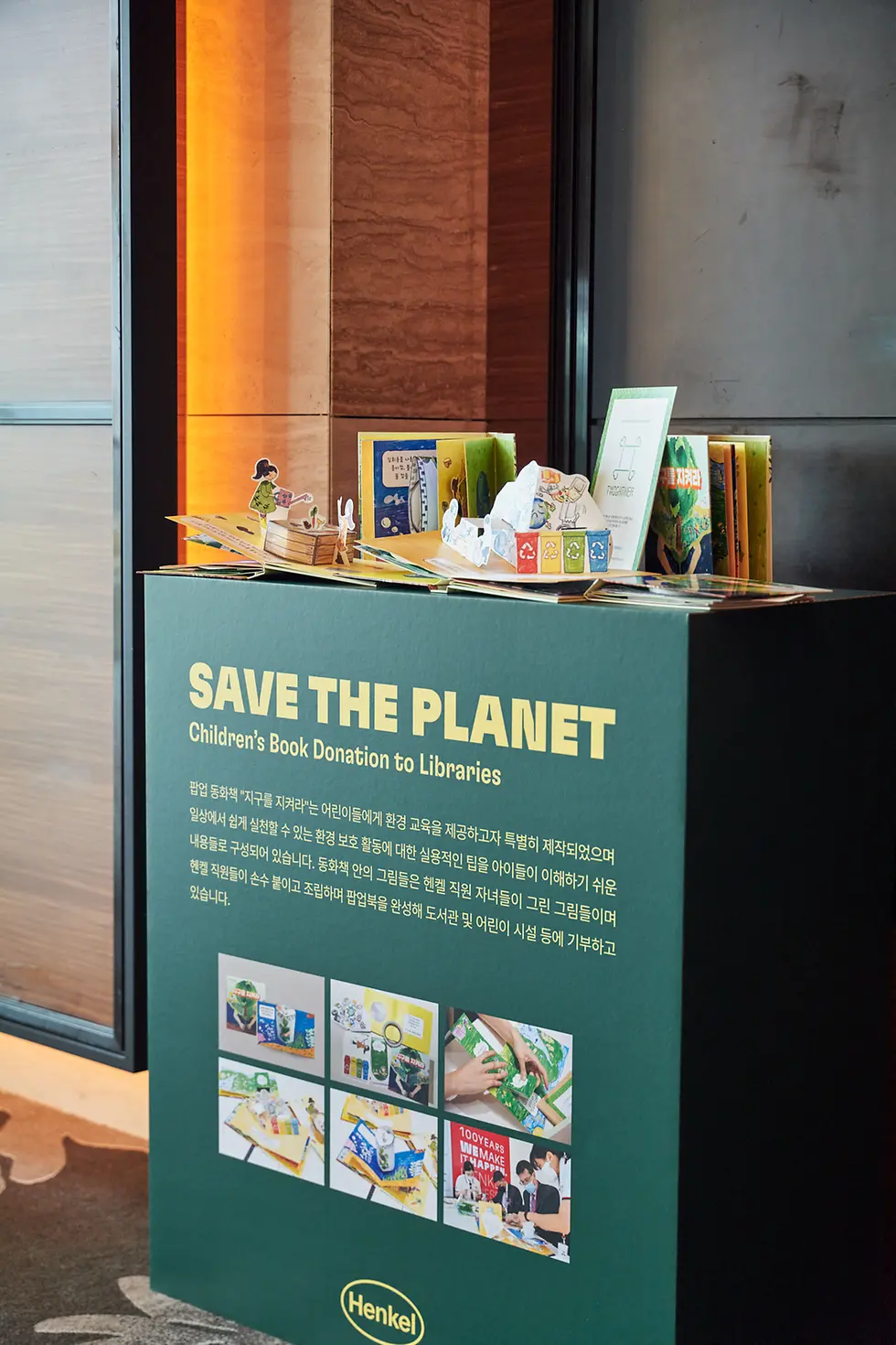 “지구를 지켜라” 동화책은 지구의 날을 맞아 진행한 어린이 그림대회 수상작 그림들이 실린 동화책으로, 헨켈코리아 임직원 자녀들의 그림도 포함돼 있어 더 의미가 깊다. 또, 팝업북 특성 상 페이지 내 입체 요소들을 붙이고 끼우는 등의 책 만들기 봉사에 헨켈 직원들이 참여해 책을 완성하는 등 기획부터 제작까지 헨켈 직원들이 함께 했다.